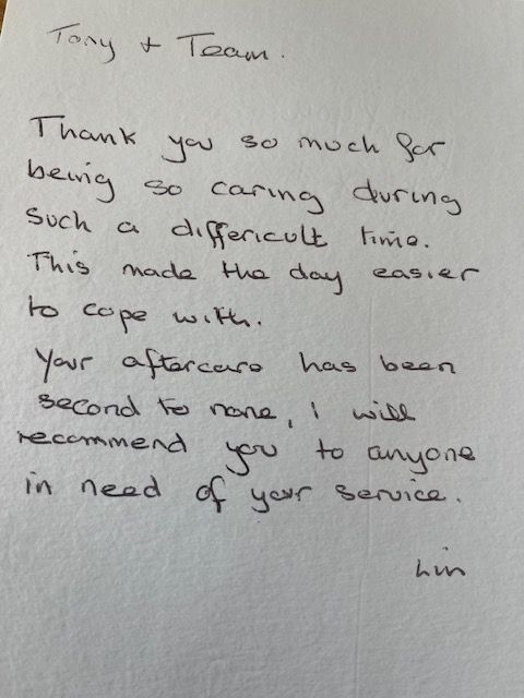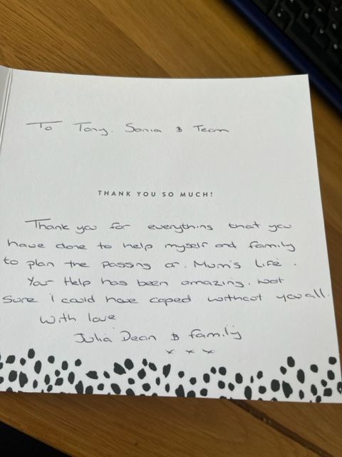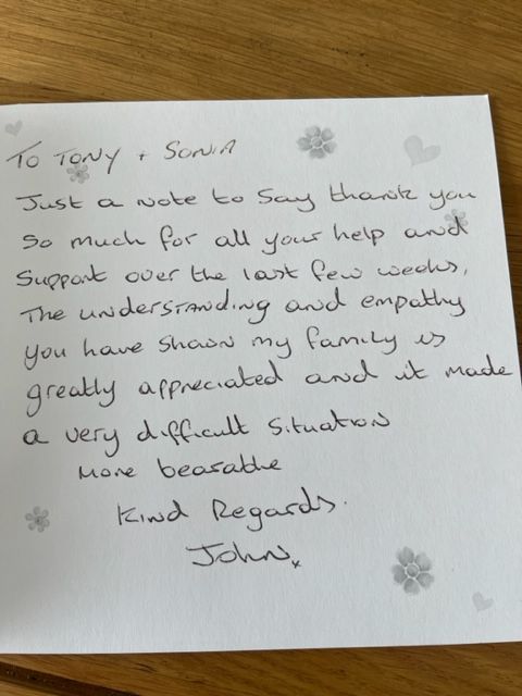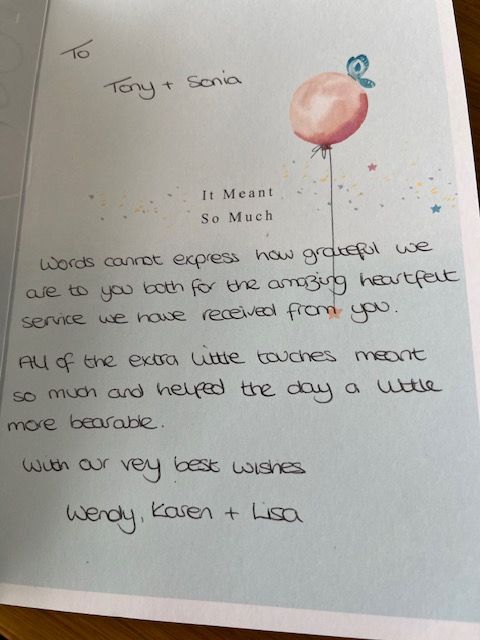 When I first met both Sonia and Tony the first thing Tony said was “we treat everyone as family” and boy did they. I felt comfortable knowing my Dad was in loving hands. Nothing was too much trouble (even some strange requests from me) the service Tony gave today was just perfect. It seems strange to say a funeral was beautiful but it was. It was everything my Dad wanted and everything we as a family needed to say goodbye.
